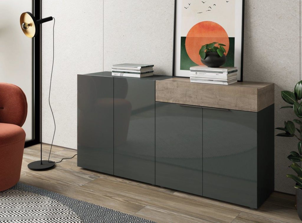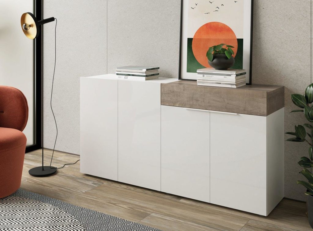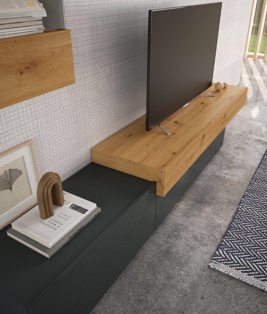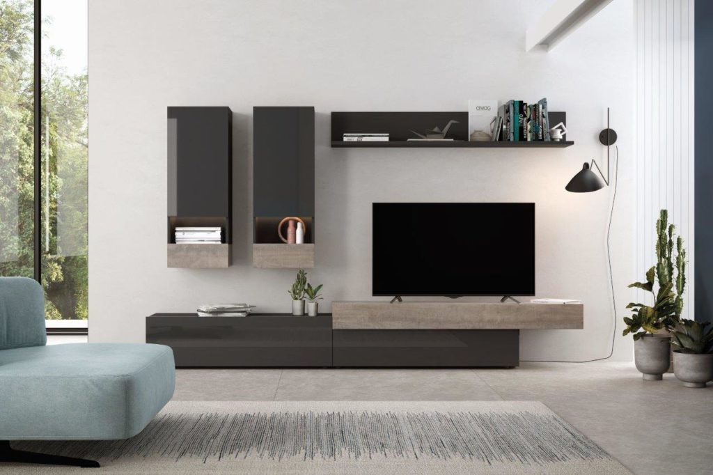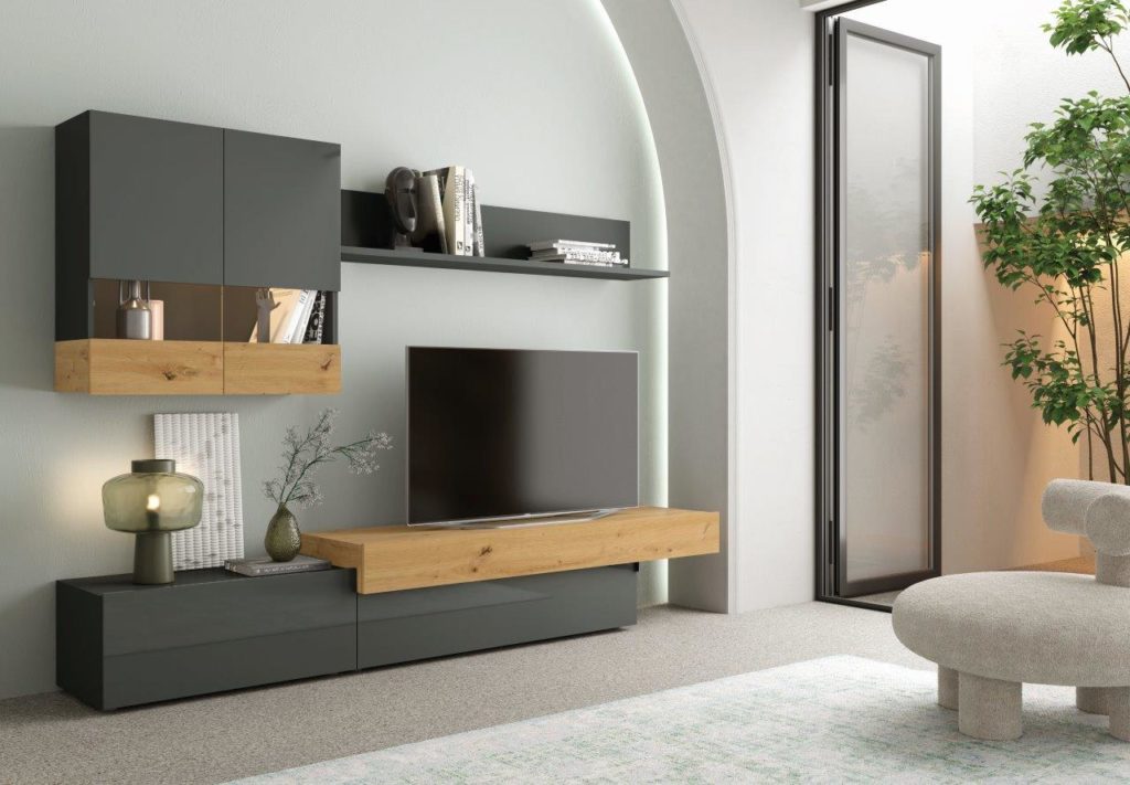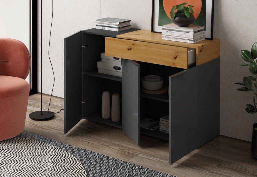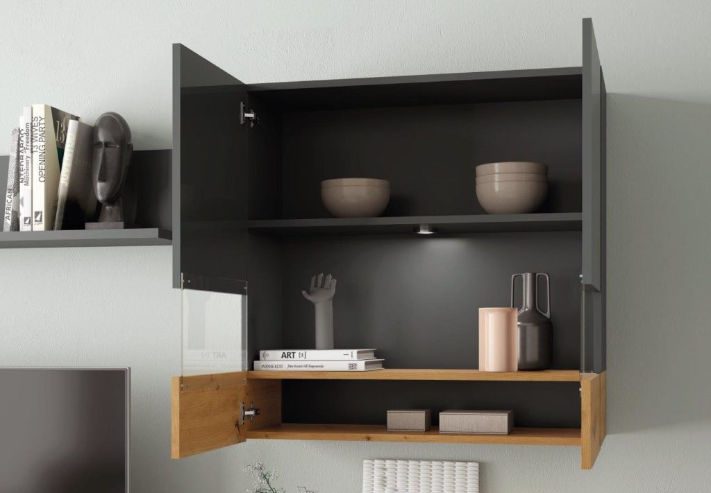 Este modelo destaca por tener todos sus frentes lacados en alto brillo, tanto en color Blanco como en color Grafito. Estos dos colores combinan perfectamente con los colores Artisan y Cemento, los cuales estarán disponibles para los detalles de los módulos.