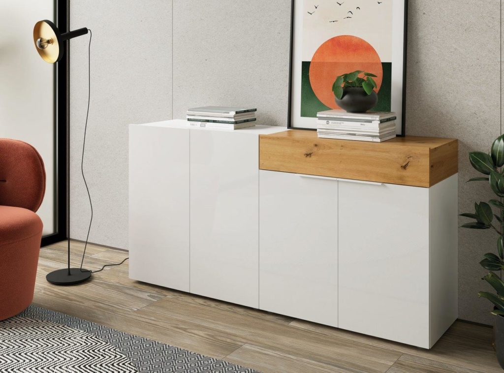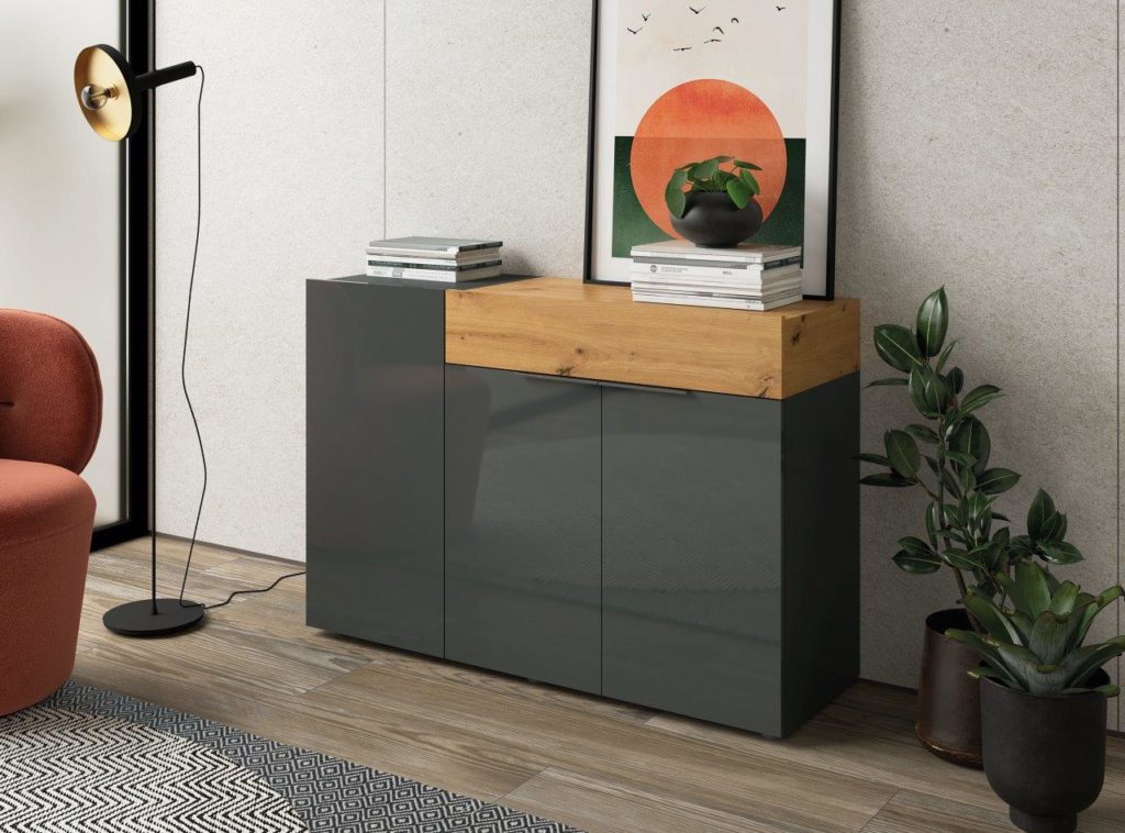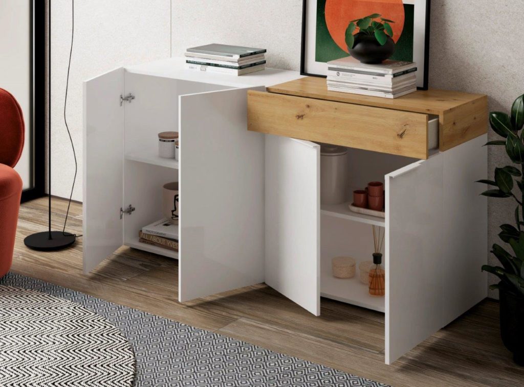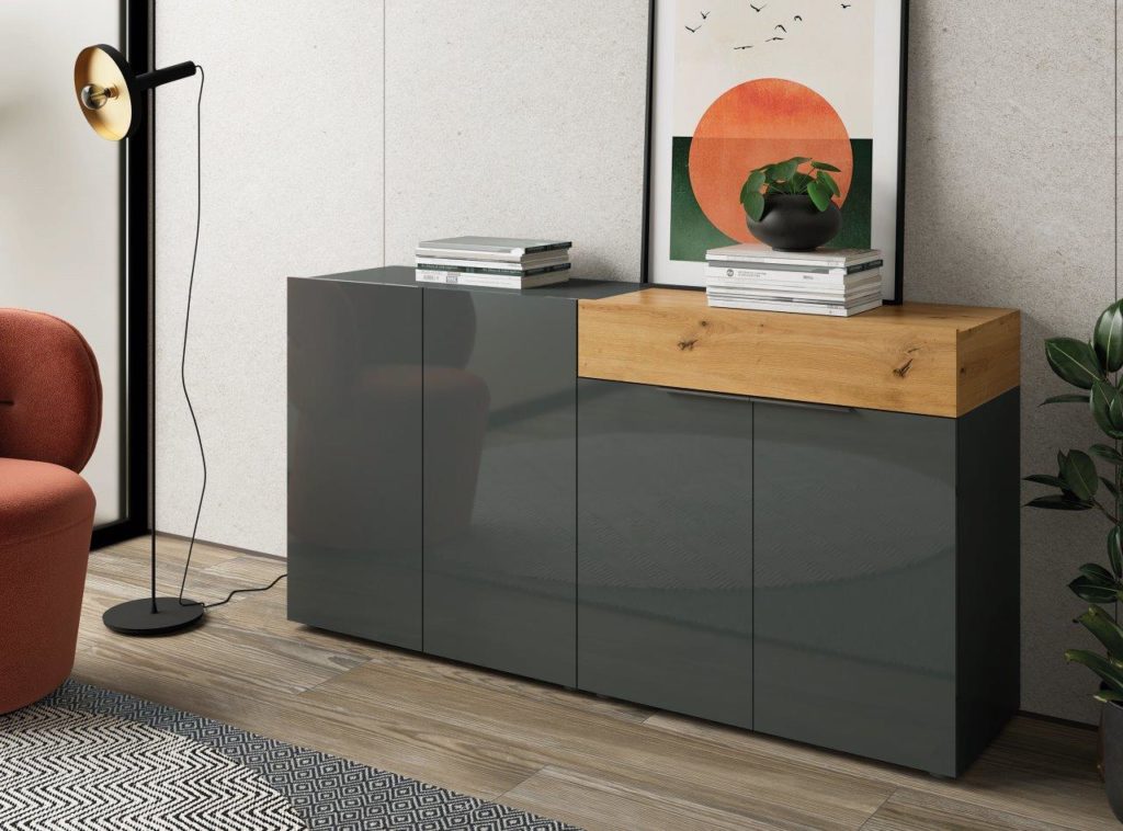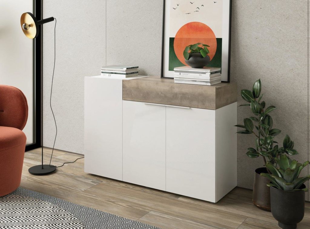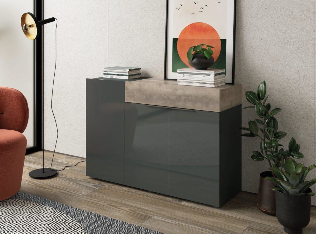 Este modelo destaca por tener todos sus frentes lacados en alto brillo, tanto en color Blanco como en color Grafito. Estos dos colores combinan perfectamente con los colores Artisan y Cemento, los cuales estarán disponibles para los detalles de los módulos.